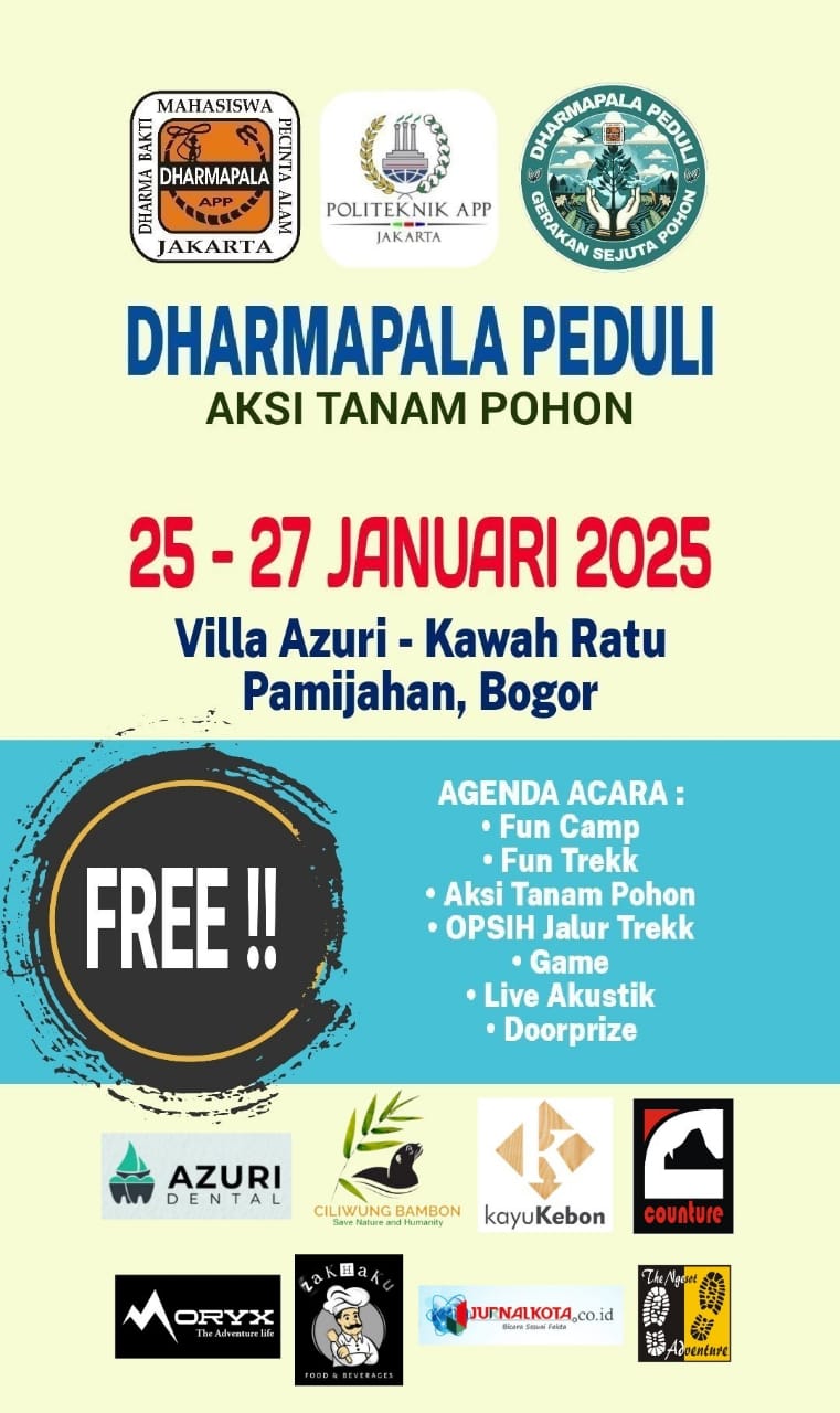 Dalam rangka mendukung salah satu program pemerintah yaitu “aksi tanam sejuta pohon” Dharmapala-APP selaku mahasiswa pecinta alam kampus Politeknik APP Jakarta yang peduli akan lingkungan turut mengadakan kegiatan penanaman seribu pohon yang akan dilaksanakan pada tanggal 25 – 27 Januari 2025 berlokasi di Villa Azuri, Pamijahan, Kab. Bogor. Kegiatan ini bertujuan untuk ikut serta membangun lingkungan yang hijau untuk melestarikan hutan, mencegah pemanasan global, dan membuat lingkungan menjadi asri.