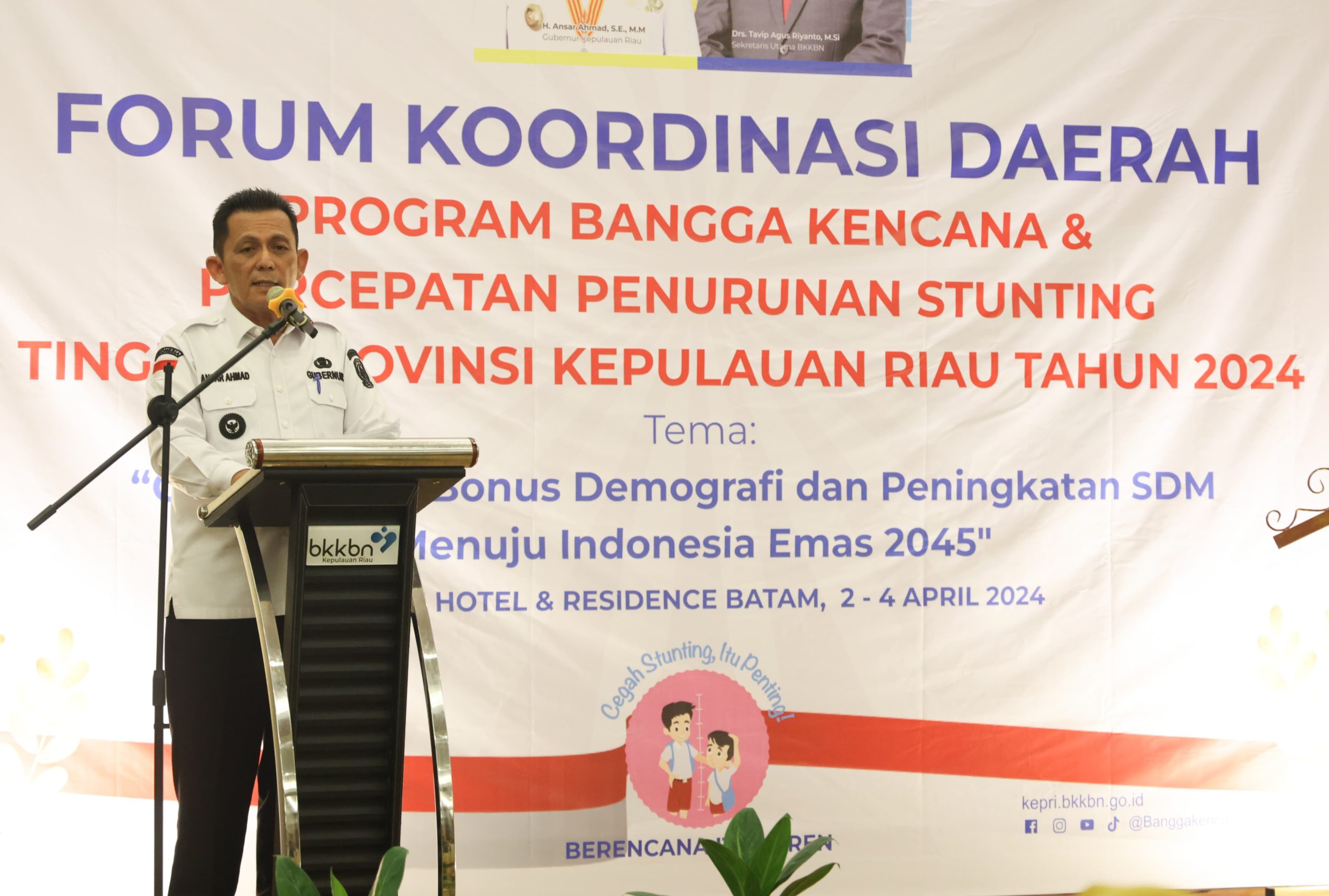 Gubernur Provinsi Kepulauan Riau (Kepri) Ansar Ahmad membuka kegiatan Forum Koordinasi Daerah Program Bangga Kencana dan Percepatan Penurunan Stunting Tingkat Provinsi Kepulauan Riau yang ditaja oleh Badan Kependudukan dan Keluarga Berencana Nasional (BKKBN) Perwakilan Provinsi Kepri bertempat di Aston Hotel & Residence Pelita, Kota Batam, Rabu (3/4/2024).