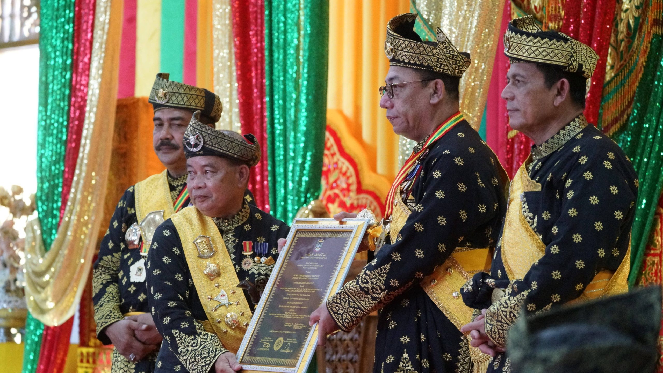 Wakapolri Komjen Pol Agus Andrianto (Dato Seri Sakti Bhayangkara Utama) yang menghadiri acara tersebut memasangkan tanda kebesaran adat berupa tanjak kepada Kapolda Kepri, serta Gubernur Kepri Ansar Ahmad yang berkesempatan pemasangan selempang dan pingat.