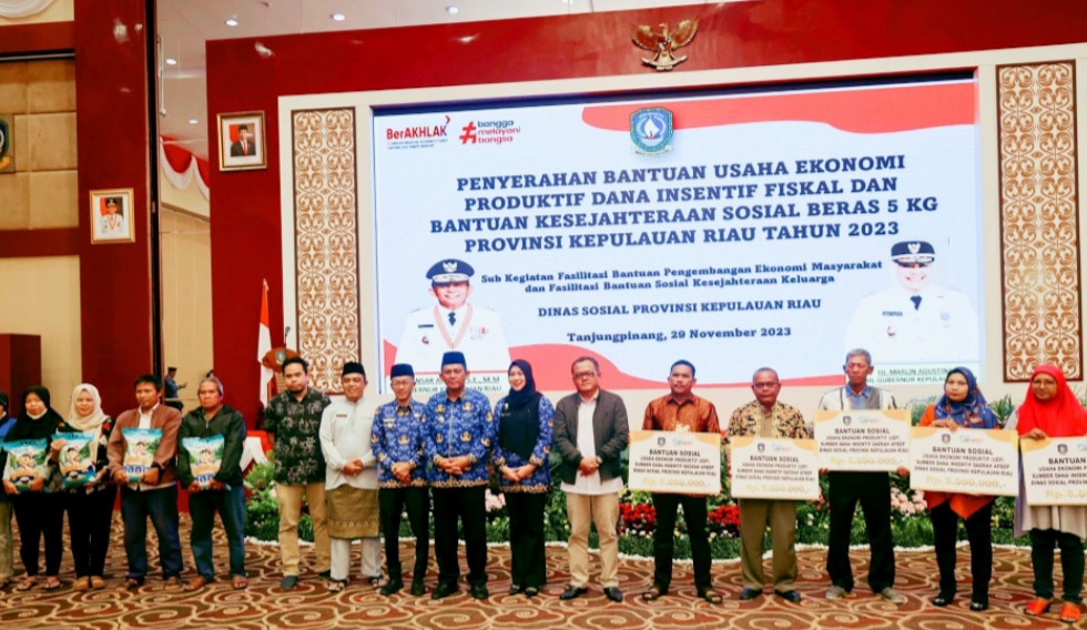 Gubernur Provinsi Kepulauan Riau (Kepri) Ansar Ahmad, menyerahkan Bantuan Sosial Usaha Ekonomi Produktif (UEP) dan Bantuan Kesejahteraan Sosial Beras kepada masyarakat Kota Tanjungpinang dan Kabupaten Bintan, di Aula Wan Seri Beni, Dompak, Kota Tanjungpinang, Rabu (29/11/2023).