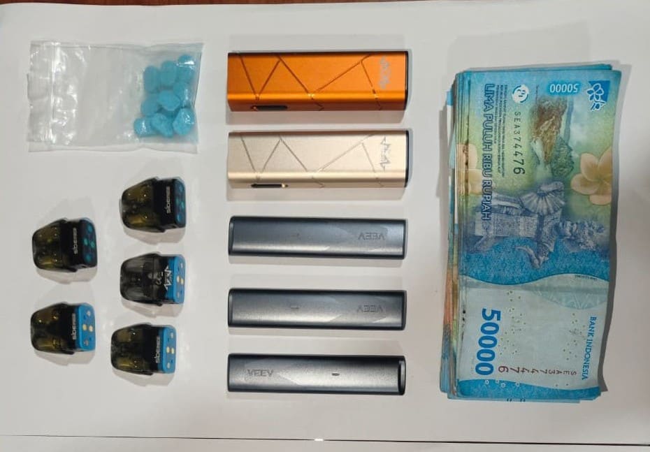 Dari tangan tersangka DLH, petugas menyita 10 butir pil ekstasi warna biru berlogo “Rolex”, lima cartridge liquid vape merek Sidepiece yang mengandung zat MDMB-4en-PINACA, tiga vape hitam merek Veev, satu vape putih, satu vape oranye, uang tunai Rp4,5 juta, serta satu unit telepon genggam yang digunakan dalam transaksi.