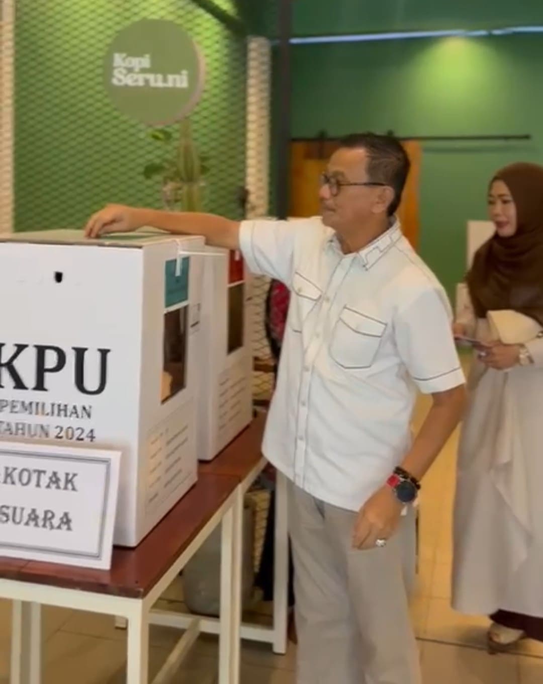 Seperti biasa, Raja Ariza selalu menyapa petugas dan warga dengan ramah dan senyum hangatnya. Kemudian Raja Ariza mengikuti alur administrasi sebelum masuk ke bilik suara untuk mencoblos.