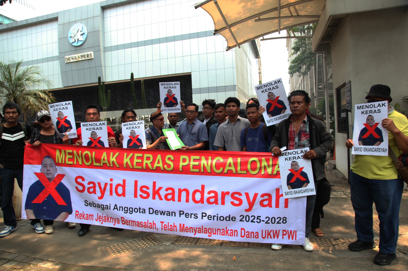 “Kami menolak pencalonan Sayid Iskandarsyah karena rekam jejaknya bermasalah dan dapat mencoreng kredibilitas Dewan Pers,” ujar salah satu pimpinan aksi dari atas pagar gedung Dewan Pers.