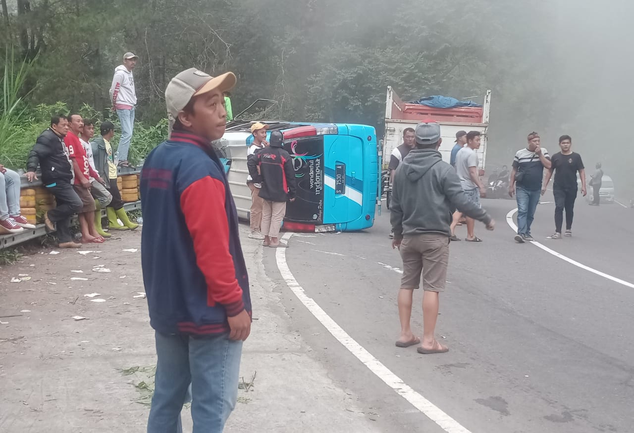 Dalam kondisi kritis itu, kendaraan terbanting ke kanan dan terguling. Beruntung, kendaraan berikut seluruh penumpangnya tidak terjun ke jurang lantaran tertahan pagar jurang.