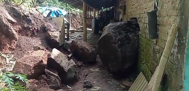 Sesaat kemudian, bukit setinggi 60 meter di samping rumah korban tiba-tiba longsor. Material berupa tanah basah bercampur bebatuan besar lepas, menghantam tembok sisi ruang tamu dan dapur.