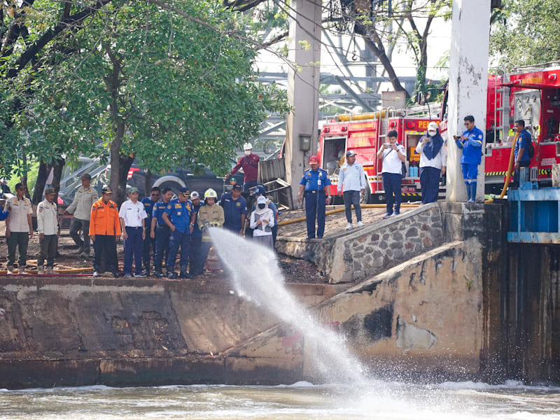 Dinas Lingkungan Hidup (DLH) DKI Jakarta bersama sejumlah instansi lintas sektoral menggelar simulasi penanggulangan busa putih yang menumpuk di Pintu Weir 3 Kanal Banjir Timur (KBT), Jakarta Utara, Rabu (13/8/2025).