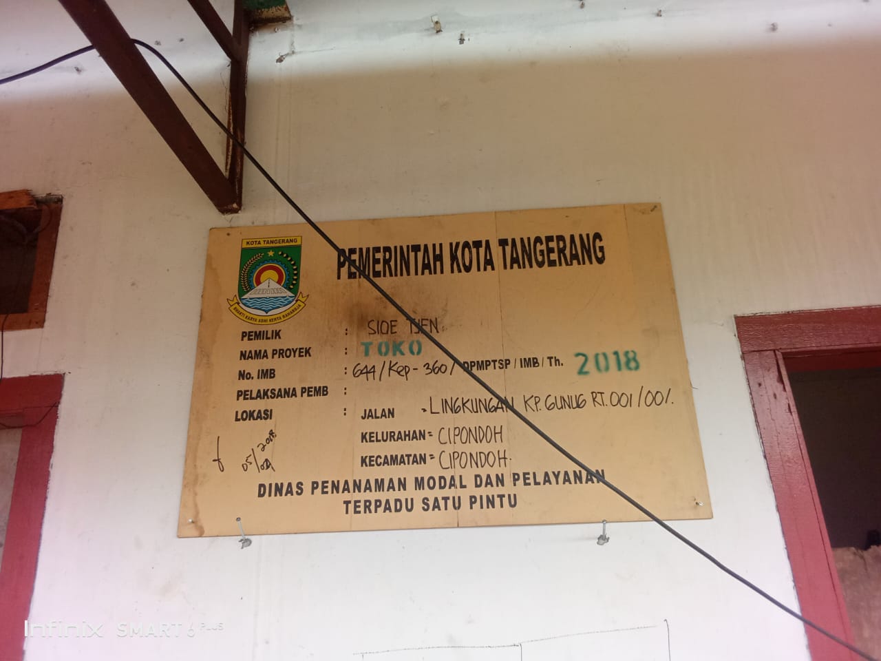 Papan informasi IMB tahun 2018 atas nama Sioe Tjen dengan peruntukan “toko” terpampang di sebuah bangunan di Cipondoh, Kota Tangerang. Dokumen tersebut tercatat berlokasi di Lingkungan Kampung Gunung RT 001/001, namun diduga tidak sesuai dengan kondisi dan alamat bangunan yang berdiri saat ini.