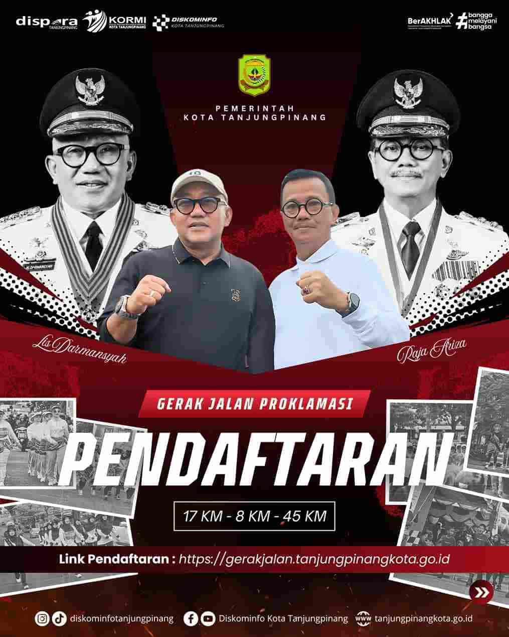 Pemerintah Kota (Pemko) Tanjungpinang akan melaksanakan kegiatan Gerak Jalan Proklamasi yang berlangsung selama 3 hari. Pendaftaran akan dibuka secara daring mulai 8 Juli 2025 melalui laman https://gerakjalan.tanjungpinangkota.go.id