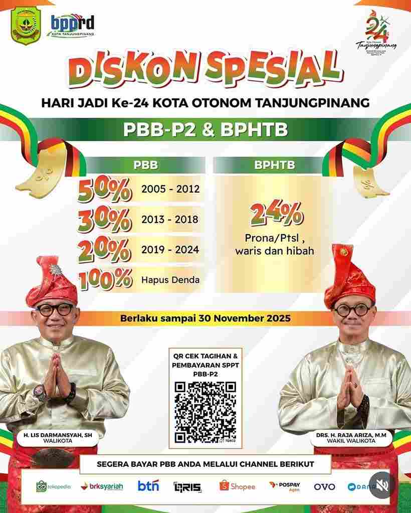 Dalam rangka memperingati Hari Jadi ke-24 Kota Otonom Tanjungpinang, Pemerintah Kota (Pemko) Tanjungpinang memberikan hadiah spesial bagi warganya berupa program diskon pajak daerah. Program ini dilaksanakan melalui Badan Pengelola Pajak dan Retribusi Daerah (BPPRD) dan berlaku mulai 20 Oktober hingga 30 November 2025.