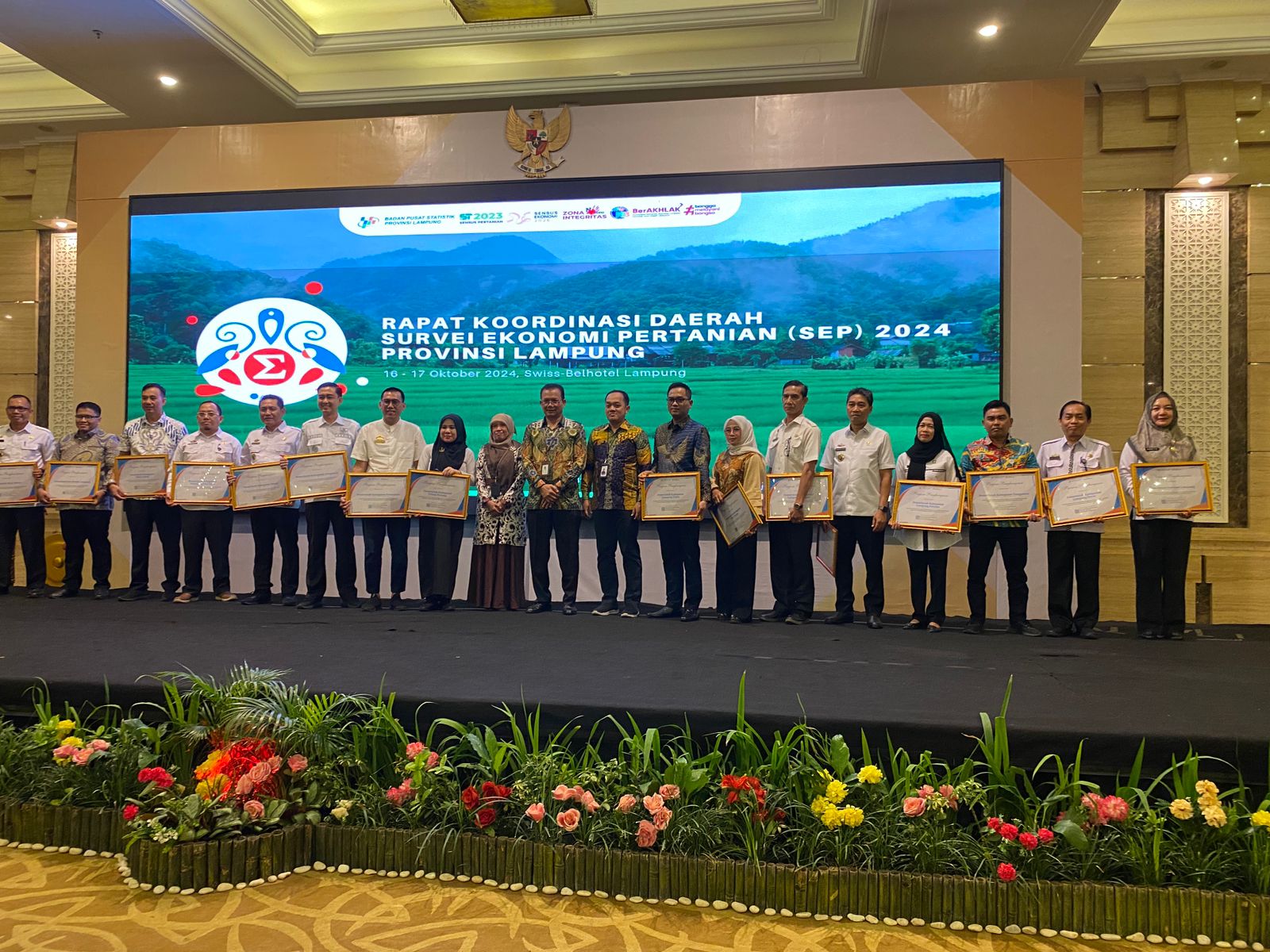Penghargaan tersebut diserahkan langsung Kepala Badan Pusat Statistik (BPS) Provinsi Lampung, Atas Parlindungan Lubis, dalam Rapat Koordinasi Daerah Survei Ekonomi Pertanian 2024, yang digelar di Swiss – Belhotel, Bandar Lampung, Selasa (22/10/2024).