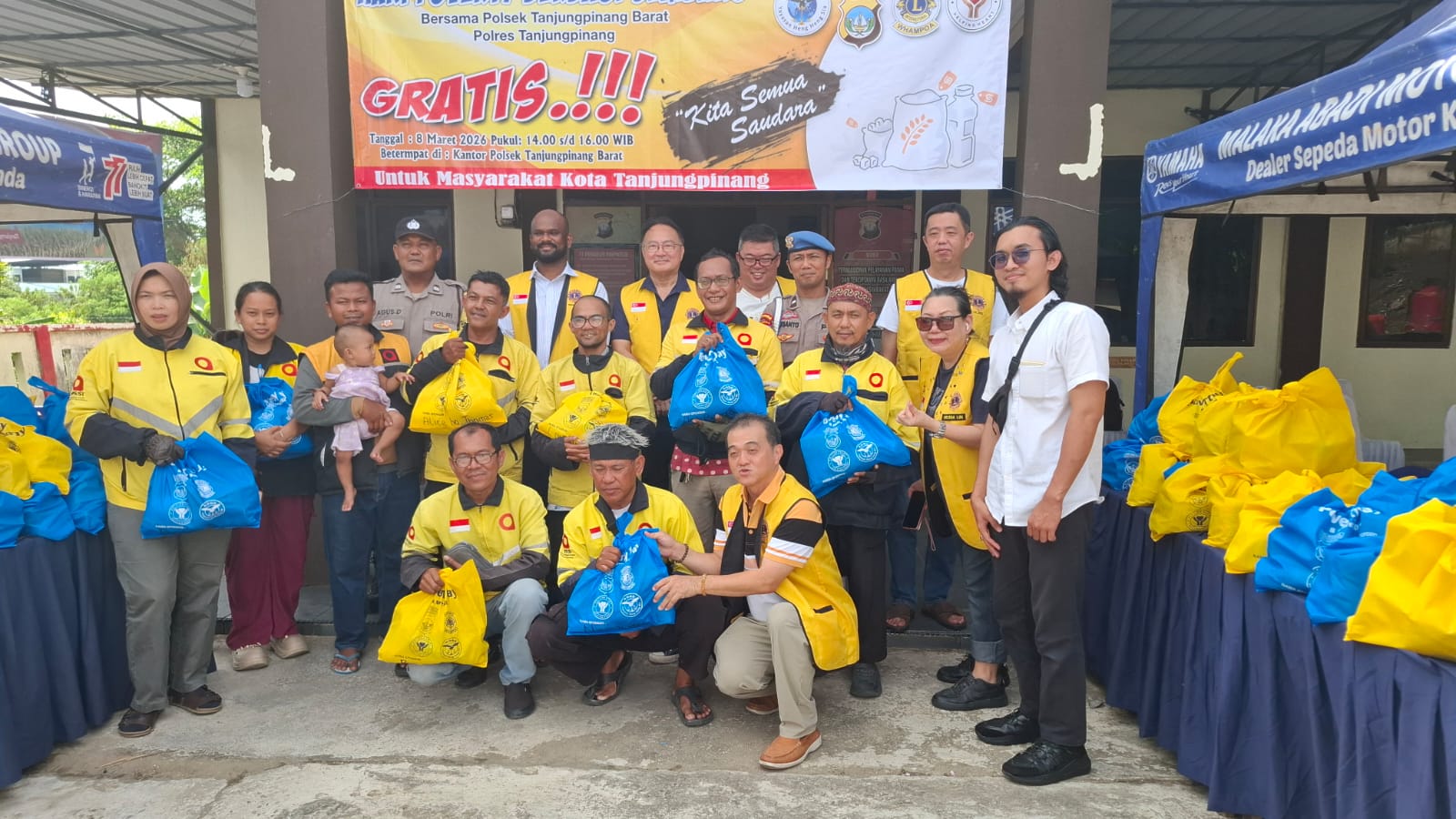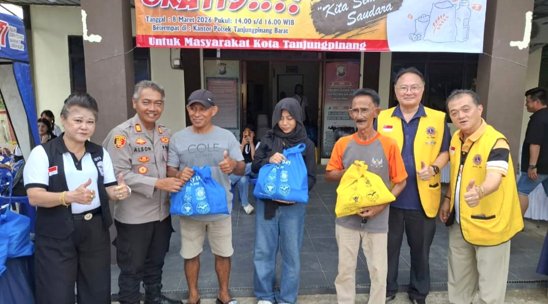 Senyum haru terlihat di wajah puluhan warga saat menerima paket sembako yang dibagikan Kapolsek Tanjungpinang Barat AKP Missyamsu Alson bersama Yayasan Heng Heng Sia dan Lions Clubs Singapore Whampoa di Mapolsek Tanjungpinang Barat, Jalan Sunaryo, Minggu (8/3/2026).