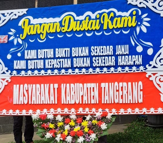 Kekecewaan itu disampaikan melalui pesan-pesan tajam yang tertulis di karangan bunga, di antaranya berbunyi, “Jangan dustai kami, kami butuh bukti bukan sekadar janji, dan kami butuh kepastian bukan sekadar harapan.”