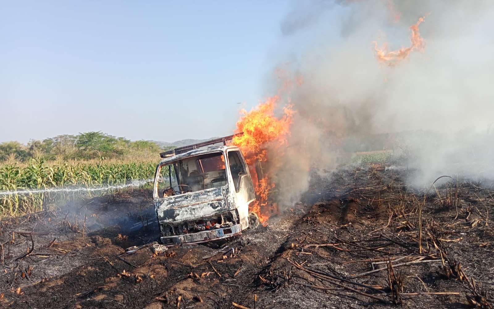 Sebuah truk yang akan memuat hasil panen tebu di wilayah Desa Banjarejo, Kecamatan Ngariboyo, Kabupaten Magetan, Jawa Timur, tiba-tiba terbakar, Rabu (30/8/2023).