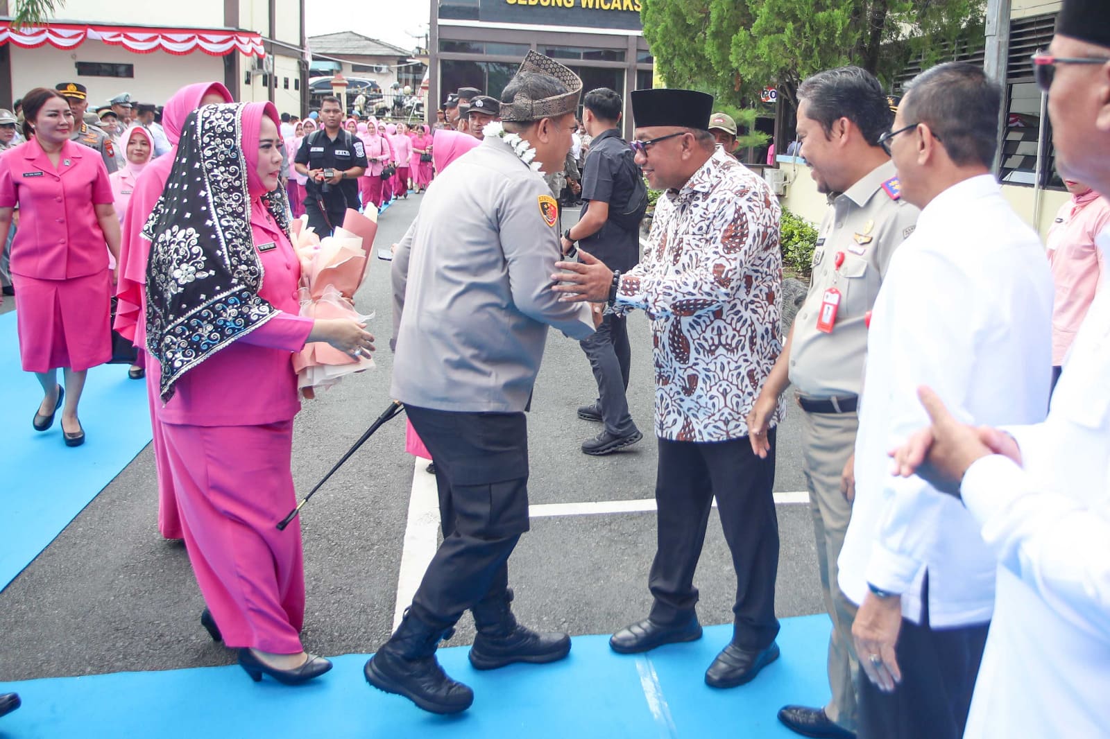 Dalam kesempatan itu, prosesi penyambutan dilakukan secara adat Melayu. Atraksi silat yang memukau, pemasangan tanjak di kepala Kapolda, serta prosesi tepuk tepung tawar menjadi rangkaian tradisi penuh makna sebagai doa restu agar Kapolda senantiasa diberikan keselamatan dan keberkahan dalam menjalankan tugas di Bumi Segantang Lada.
