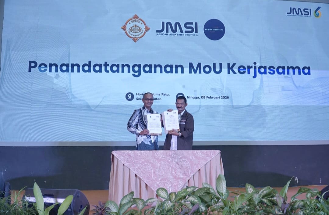 Penandatanganan MoU dilakukan di sela peringatan enam tahun JMSI yang berlangsung di Hotel Horison Ultima Ratu, Kota Serang, Banten, Minggu (8/2/2026). Agenda tersebut bertepatan dengan rangkaian puncak peringatan Hari Pers Nasional (HPN) 2026 yang digelar di Kota Serang pada 6–9 Februari 2026.