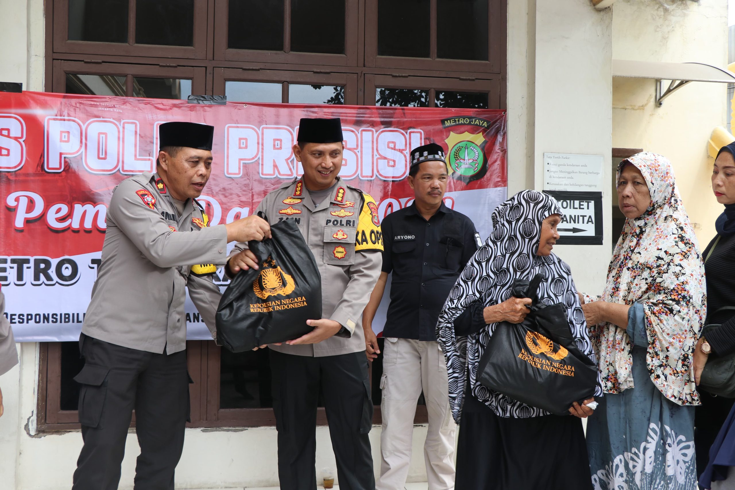 Kapolres Kota Tangerang, Kombes Pol Zain Dwi Nugroho bersama Pejabat Utama (PJU) Polres Metro Tangerang Kota Polda Metro Jaya, menyerahkan Bantuan Sosial (Bansos) berupa paket sembako ke warga yang membutuhkan di RW 01, Kelurahan Kebon Besar, Kecamatan Batuceper, Kota Tangerang, Jum’at (22/12/2023).