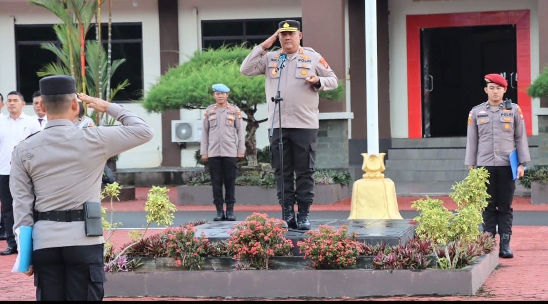Kapolres Lingga, AKBP Pahala Martua Nababan, memimpin pelaksanaan apel pagi pada jam pimpinan di Lapangan Tribrata Polres Lingga, Kabupaten Lingga, Senin (3/11/2025).