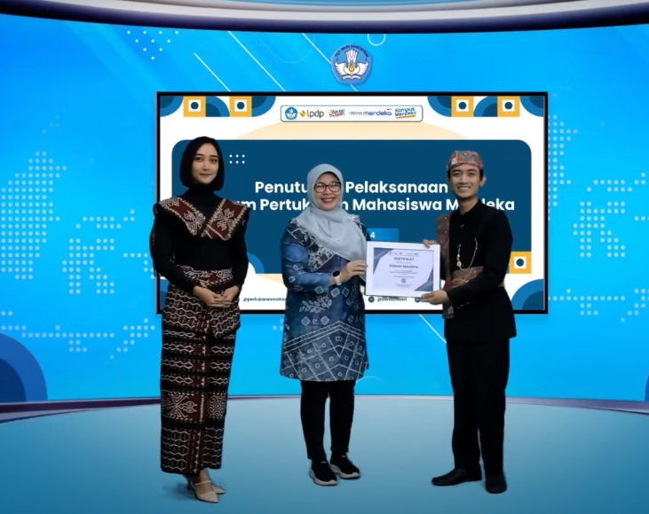 Sebelum acara berakhir, Kepala Program Pertukaran Mahasiswa Merdeka dan Kampus Mengajar, Asri Aldila Putri bersama Direktur Pembelajaran dan Kemahasiswaan, Sri Suning Kusumawardani memberikan secara simbolis berupa sertifikat kepada perwakilan mahasiswa PMM Angkatan 4, Ridwan Maulana sebelum menutup acara. (Haris)