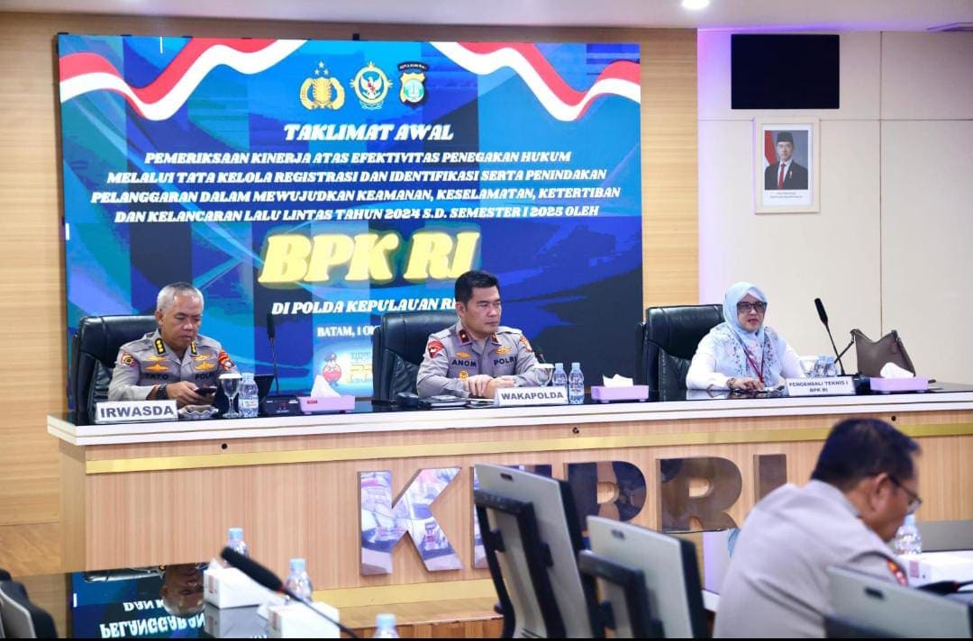 Polda Kepulauan Riau (Kepri) menerima kunjungan Tim Badan Pemeriksa Keuangan (BPK) RI Gelombang I dalam rangka Taklimat Awal Pemeriksaan Terinci Kinerja Keamanan, Keselamatan, Ketertiban, dan Kelancaran Lalu Lintas (Kamseltibcarlantas) Tahun Anggaran 2025. Kegiatan berlangsung di Rupatama Polda Kepri, Rabu (1/10/2025).