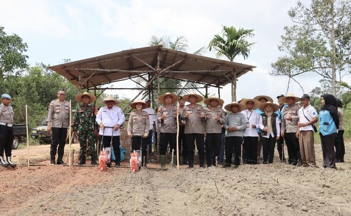 Suasana penanaman berlangsung dengan semangat gotong royong. Masyarakat bersama aparat kepolisian bekerja bahu-membahu di lahan yang disiapkan di wilayah Kecamatan Gunung Kijang.