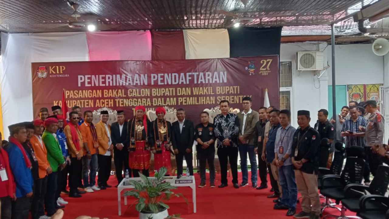 Ribuan massa dan simpatisan dari berbagai elemen masyakarat ikut serta mengantarkan pasangan bakal calon Bupati Aceh Tenggara priode 2024-2029, Raidin Pinim-Syahrizal (RASA) saat melakukan pendaftaran ke kantor Komisi Independen Pemilihan (KIP) pada Rab, (28/08/2024).