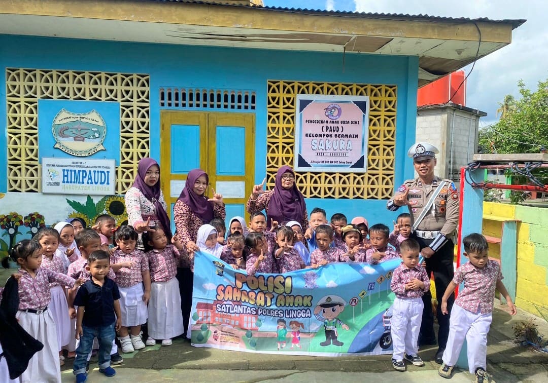 Unit Keamanan dan Keselamatan (Kamsel) Satlantas Polres Lingga melaksanakan kegiatan Polisi Sahabat Anak (Polsanak) bersama siswa-siswi PAUD Sakura di Dabo Singkep, Kabupaten Lingga, Rabu (26/11/2025).