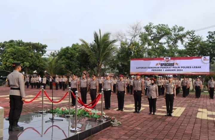 Awal Tahun Baru 2024, Polres Lebak Polda Banten melaksanakan Upacara Kenaikan pangkat Personil Polres Lebak Periode 1 Januari 2024 di lapangan Mapolres Lebak, Selasa (2/1/2024).