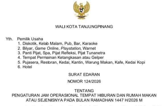 Pemerintah Kota (Pemko) Tanjungpinang menerbitkan Surat Edaran (SE) Nomor 124/2026 tentang Pengaturan Jam Operasional Tempat Hiburan dan Rumah Makan selama Ramadan 1447 H/2026 M.